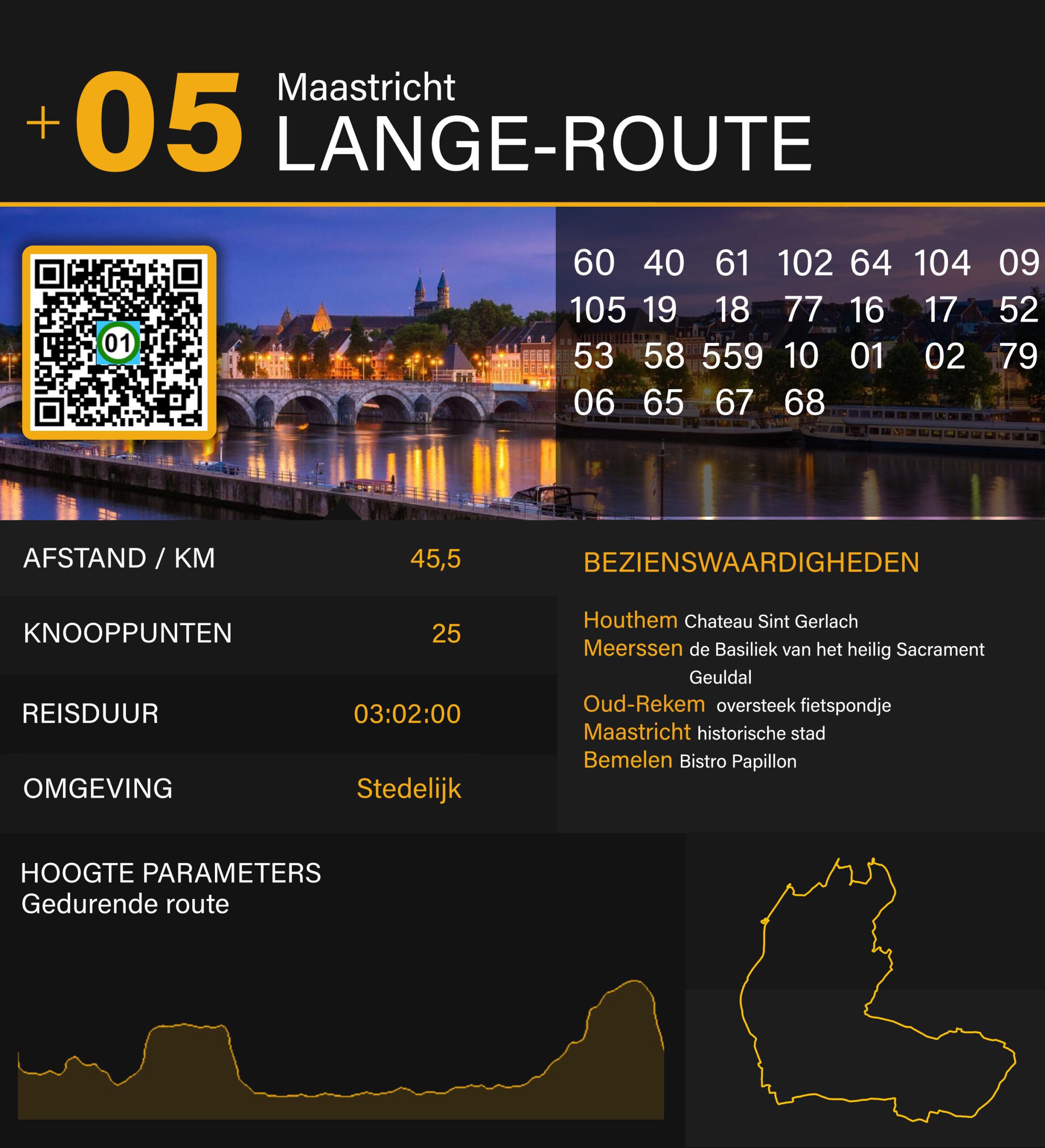 Start in het natuurgebied Ingendael en fiets via het groene heuvelland naar Houthem, waar het imposante Château Sint Gerlach aan de route ligt. Daarna duik je het schilderachtige Geuldal in, op weg naar Meerssen, een gezellig dorp waar je even door het centrum fietst.